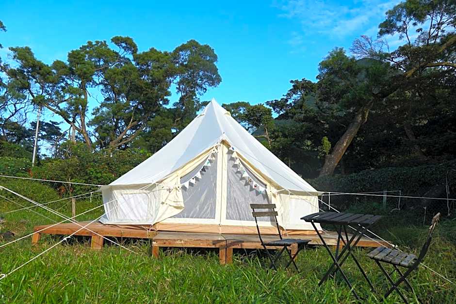 Accommodations range from a Family room with a Shared Bathroom (140 sqft) for up to 8 adults and 4 children, featuring 1 double bed and 1 bunk bed, to a Dormitory, Quadruple with four bunk beds; a Twin Room; and other dormitory configurations, including 6-bed layouts. Glamping options add Bell Tent experiences, such as Quadruple and Triple Bell Tents, plus a Glamping Bell Tent.